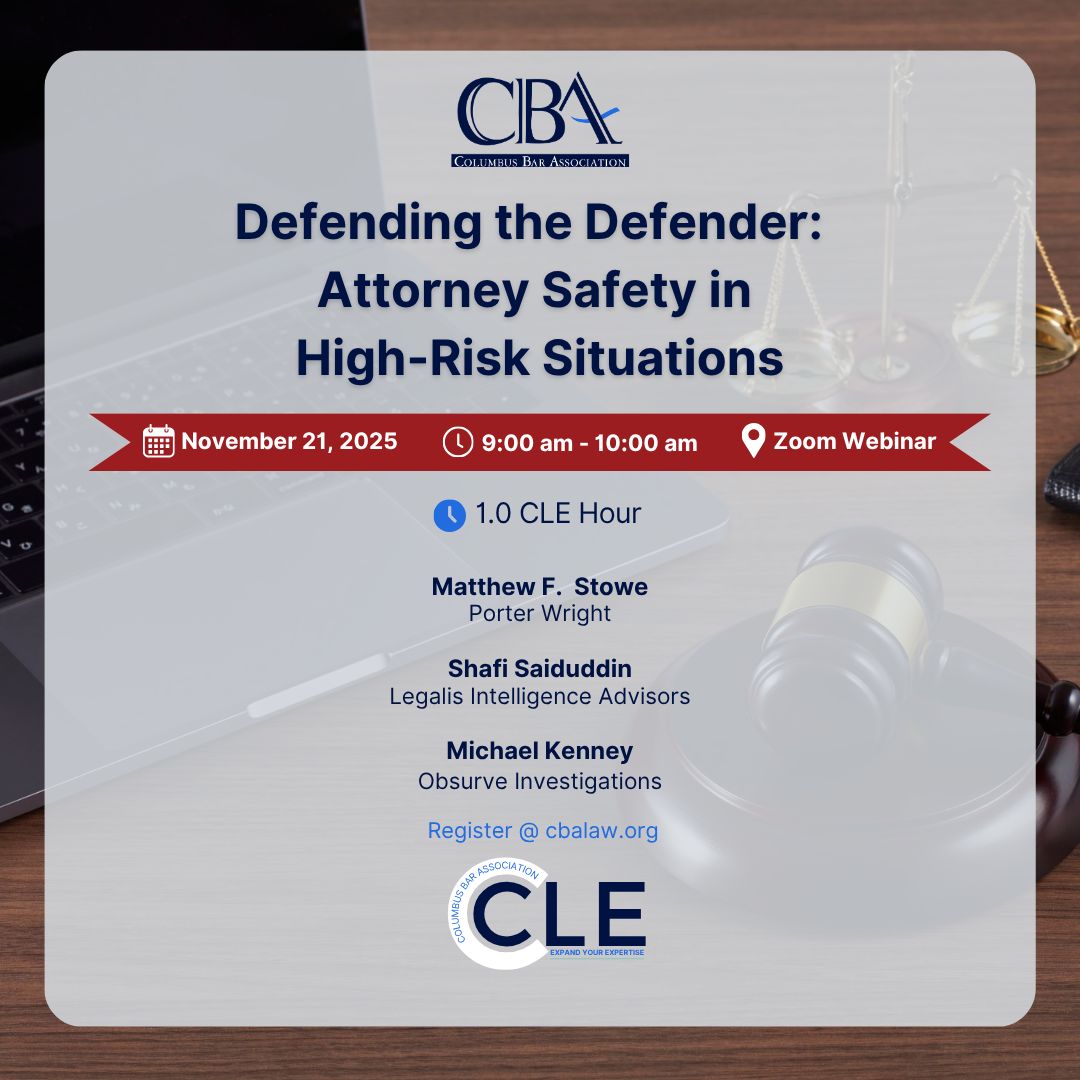 Shafi Saiduddin, CEO of Legalis Intelligence Advisors, will join a panel presenting “Defending the Defender: Attorney Safety in High-Risk Situations” at the Columbus Bar Association. This presentation will provide one hour of CLE credit and takes place on November 21, 2025 from 9:00 AM – 10:00 AM. For more information or to register for this event, click here.